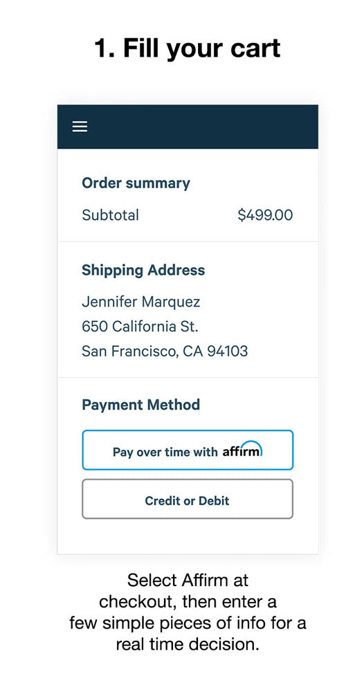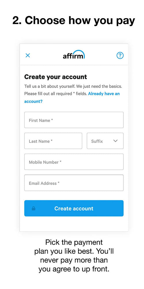 Rates from 0% APR or 10–36% APR based on credit, and is subject to an eligibility check. 0% APR is subject to change. For example, a $800 purchase might cost $72.21/mo over 12 months at 15% APR. Payment options through Affirm are subject to an eligibility check and are provided by these lending partners: affirm.com/lenders. Options depend on your purchase amount, and a down payment may be required. CA residents: Loans by Affirm Loan Services, LLC are made or arranged pursuant to a California Finance Lenders Law license. For licenses and disclosures, see affirm.com/licenses.