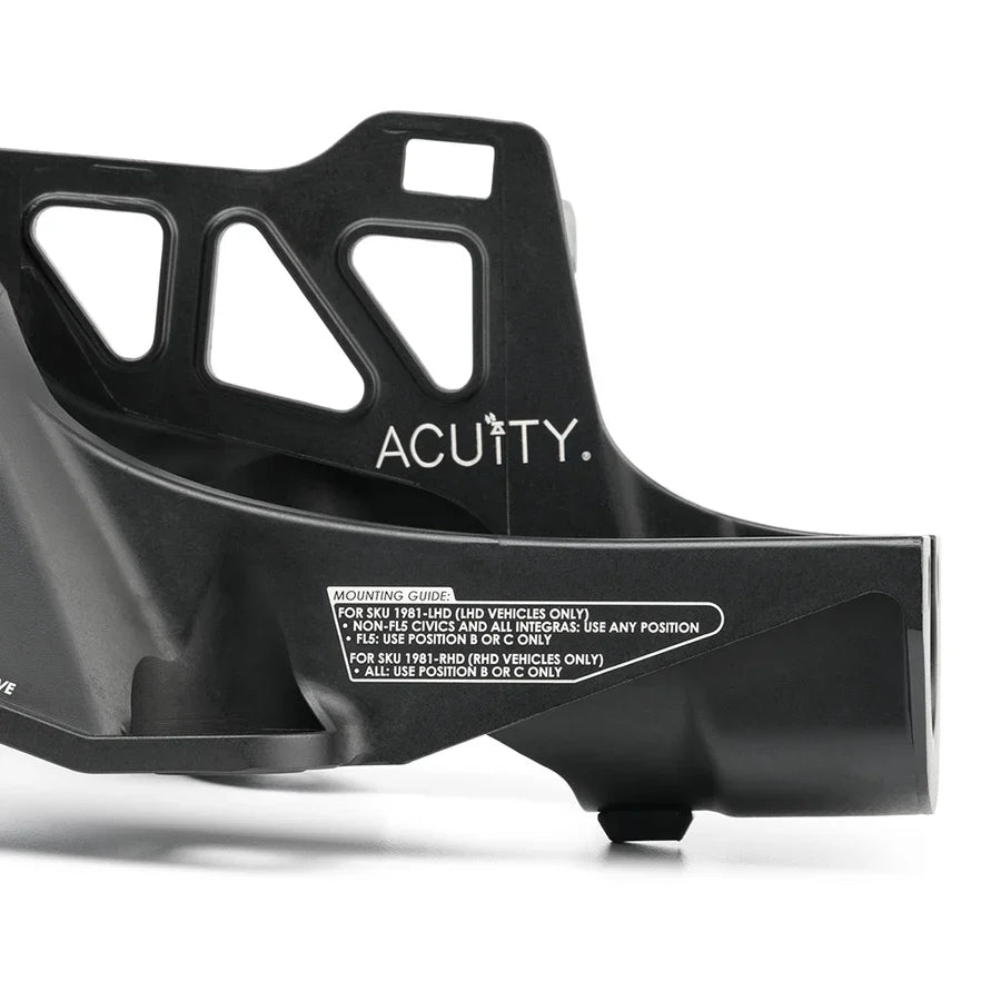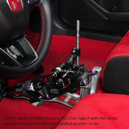 The shifter's unique architecture, premium materials and high precision components grant it an unrivaled shift feel and confidence-inspiring gear engagement in a form factor that still fits under the factory console and shift boot. Seasoned tuners will appreciate the thoughtful touches like laser-marked tech info, wire harness routing points, and how all 4 adjustments can be changed with just a 5mm hex key. Shift knob height is adjustable within an impressive, class-leading 75mm (2.9") range, and slotted mounting points permit the shift knob position to be adjusted laterally (left/right). Gear throw and gate spacing are also independently adjustable and are easily tweaked thanks to ACUiTY's slotted adjustment design. Using the knob height, lateral position, gate spacing and gear throw adjustments, it's easy to tune the H-pattern of your shifter to suit your own unique driving style.