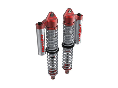 These 2.5" diameter coilovers feature race-winning engineering components that have 20+ years of testing, made into a specifically designed kit that will bolt directly onto your side-by-side. This kit offers adjustable ride height and Sway-A-Way’s new Mid-Speed Compression Adjusters for superior off-road damping curves without sacrificing any off-road comfort or handling. These coilovers are 100% designed and built in the USA and feature bright zinc plated steel cylinder bodies and CNC machined aluminum components. The kit comes pre-set for original ride height and damping while also including a spanner wrench to change spring pre-load and spring crossover stop nuts to allow for fine tuning. Whether you are riding dunes, racing, or blasting across the desert, these coilovers allow you to find your ideal setup for the given conditions. This package is designed as a direct fit application and requires no modifications to the vehicle. Sway-A-Way’s new 2.5 Series Mid-Speed Compression Adjusters mount directly into the piggyback attachment. Offering 16 clicks of resolution, the compression adjuster can go from the unrestricted, fully open (soft) position, to the fully closed (hard) position – offering up to a 200% increase in damping force, in just two full turns of the GF polymer adjuster knob. Rebound damping will remain unaffected regardless of the setting and valving combination chosen. Constructed from billet 6061-T6 aluminum, the red anodized and laser etched housing is built to withstand the harshest of environments with excellent corrosion resistance. The metering piston is CNC machined from 7075-T6 aluminum to provide the best service life for high speed applications. Sway-A-Way’s mid-speed compression adjusters are an excellent solution for any application that varies weight often, or that might be used in a variety of terrains where a quick adjustment is desired for optimizing the comfort level of your ride.