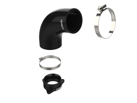 This turbo inlet removes the air flow restriction of the factory turbo inlet and guarantees the maximum air flow to the turbo for maximum power. It provides a smooth transition for the air from the factory air intake tube to the turbo with the minimum restriction. Precisely CNC machined out of 6061-T6 billet aluminum, the adapter mounts directly onto the turbo and guides the increased air flow from the Takeda intake into the turbo. . It is black anodized for durability and a stealthy appearance. This turbo inlet utilizes a flexible silicone coupling that is reinforced with three layers of polyester material, making it resistant to wear and deterioration. The silicone coupling mates directly to the aluminum turbo adapter and the factory air intake tube. All necessary clamps are provided. All necessary clamps and hardware are provided for a fast and easy installation. The factory harness bracket mounts directly onto the aluminum adapter for perfect fitment. This item will only fit with the factory air intake system. It will NOT fit with Takeda air intake systems P/N: 56-10021D, 56-10021R, 56-70021D and 56-70021R. For use with Takeda air intake system, see part number 59-20002.