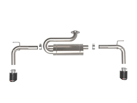 This axle-back exhaust system is constructed of 2-1/2 IN mandrel-bent 304 stainless steel tubing for maximum strength and durability. This system features a high-flow 304 stainless steel muffler, producing a mild sound. Finishing off this exhaust system are dual 4-1/2 IN diameter carbon fiber 304 stainless steel clamp-on exhaust tips. The tips features an aFe POWER logo for a unique style. This system produces a mild sound unleashing all available horsepower and torque. Utilizing a factory style flange and hangers this system is a direct bolt-on system, which requires no cutting or modifications for a hassle-free installation. State-of-the-art computer-aided design technology is utilized for precise vehicle fitment. 100% MIG-Welded for race-proven strength and durability.