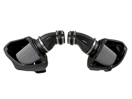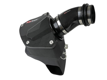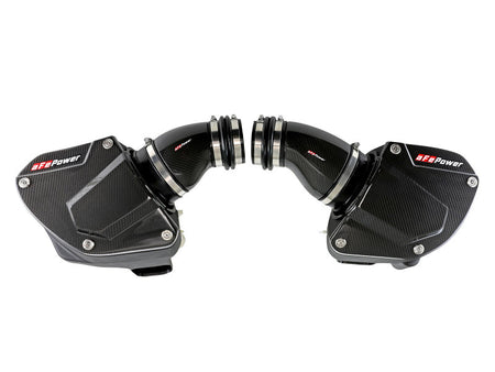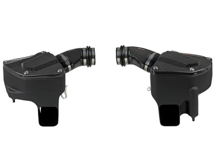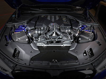 These 7" tall, 360-degree radial flow air filters were specially designed to be installed through the M5's strut braces, maximizing airflow and making for an easy installation. They feature our oil-free Pro DRY S media with three layers of progressively finer synthetic media for maximum convenience. This media is perfect for street use. The air filters are surrounded by heat-resistant XLPE polymer housings. Covers, constructed from 100% twill weave carbon fiber, are secured to the housings with premium aFe POWER branded hardware - making for an aggressive style and simple air filter inspection. Lightweight, high gloss, twill weave carbon fiber tubes direct filtered air from the air filters to the engine. Using computer design software and dyno tuning, they're designed to achieve maximum power gains while maintaining a perfect fit. This is a direct fit intake system that utilizes factory mounting points and requires no cutting or modifications. All necessary clamps, couplings, premium hardware, and a Black Series plate are included. Optional 100% carbon fiber Dynamic Air Scoops (sold separately P/N: 58-10005SC) are available to bring more cool air from the kidney grilles into the intake housings