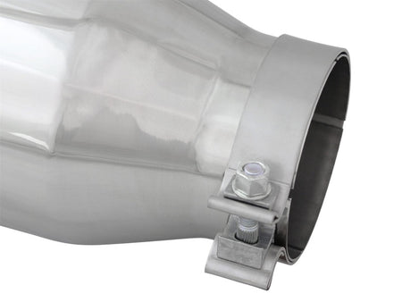 aFe Power is proud to introduce the all new diesel exhaust tip. This tip comes with a black finish and is designed to fit 4" exhaust systems. With a 4" inlet x 6" outlet and 15" inch length, this single-walled, angle cut rolled tip comes with a unique laser-cut aFe Power logo plate riveted on for an aggressive style. Leak-Free Seal: A high quality stainless steel band clamp is used for a complete 360 degree sealing surface. aFe Badging: The exhaust tip comes with a unique laser-cut aFe Power logo plate riveted on for an aggressive style.