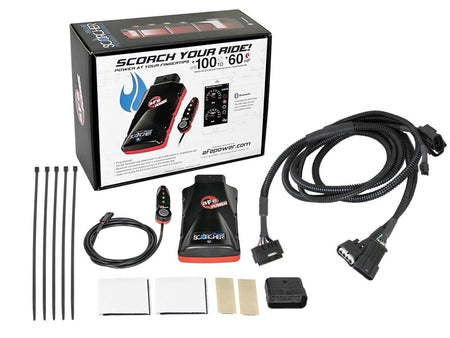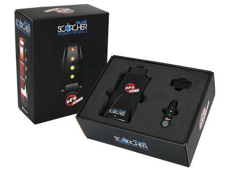 aFe POWER SCORCHER BLUE Power modules are the next generation of plug-and-play electronic module technology. It is the fastest way to safely gain significant horsepower, torque and improve drivability without modifying or leaving any trace on the Engine Control Unit (ECU). The SCORCHER BLUE features an LED control switch for in-cabin, on-the-fly power adjustments with different preset modes. With Bluetooth connectivity you can tap into your iOS or Android device to make power adjustments, custom tune different power modes, view gauges for engine parameters, upgrade to the latest version, measure acceleration times and more. The SCORCHER BLUE Power module increases turbo boost and overall vehicle performance, producing triple-digits horse power and triple-digits torque gains on our in-house dyno. Designed with factory-style connectors, it easily connects to engine sensors for a quick and simple install. The LED control switch can be routed through the firewall into the cabin or connect to the module via Bluetooth with the smartphone app. In-cabin, on-the-fly power adjustments can be made to accommodate your driving needs. Select one of four power settings on the in-cab LED control switch or control the module remotely via the free iOS or android app. The smartphone connects to the module via Bluetooth and displays engine parameters (MAP). This power module has four power settings loaded and identifiable with the LED light on the switch or smartphone app: Stock (Green), Sport (Yellow), Sport+ (Orange) and Race (Red). The SCORCHER BLUE module is Bluetooth 4.0 capable and can connect to most iOS or Android devices. Bluetooth connectivity allows control of the module from you mobile device without the need to run any wires through the firewall. It also displays turbo boost gauge (MAP), allows you to customize each power mode, upgrade to the latest revision and even measure 0 to 60 ¼ mile times.