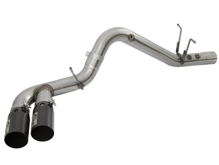 Simple Installation: All systems use factory mounting locations providing stability and hassle-free installation. Leak-Free Seal: High quality band clamps are included for a complete 360 degree sealing surface. OE Fit: OE-style bayonet hangers are used to maintain a stable pipe location during high vibration and high heat conditions. The bayonet tip holds the hanger bushing in place for an OE-style fit that does not change with time. Flow and Performance This exhaust system is constructed of 4" mandrel-bent stainless steel tubing for maximum flow. Smooth transition bends allow for low turbulence, increasing horsepower, torque and lowering EGT's. 5" Diameter Black Intercooled Tips: Finishing off the exhaust are 5" diameter, Hi-Temp black, stainless steel straight cut tips with intercooling vents designed to reduce exhaust gas temperatures at the tailpipe. A unique stainless steel laser-cut aFe Power logo plate is riveted on for an aggressive style. **Cutting stock exhaust is required.