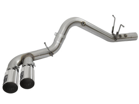 Simple Installation: All systems use factory mounting locations providing stability and hassle-free installation. Leak-Free Seal: High quality band clamps are included for a complete 360 degree sealing surface. OE Fit: OE-style bayonet hangers are used to maintain a stable pipe location during high vibration and high heat conditions. The bayonet tip holds the hanger bushing in place for an OE-style fit that does not change with time. Flow and Performance This exhaust system is constructed of 4" mandrel-bent stainless steel tubing for maximum flow. Smooth transition bends allow for low turbulence, increasing horsepower, torque and lowering EGT's. 5" Diameter Polished Intercooled Tips: Finishing off the exhaust are 5" diameter, polished, stainless steel straight cut tips with intercooling vents designed to reduce exhaust gas temperatures at the tailpipe. A unique stainless steel laser-cut aFe Power logo plate is riveted on for an aggressive style. **Cutting stock exhaust is required.