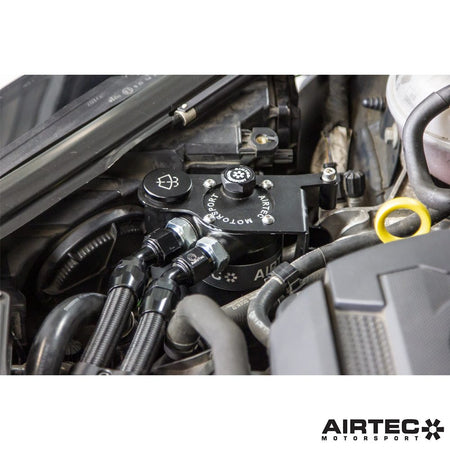 AIRTEC Motorsport’s solution to developing a catch can kit specifically for the Golf R model utilises the available space to integrate seamlessly within the engine bay. It features a high-quality, laser cut bracket finished in powder coated black, which allows the catch can to attach neatly in place and also locates the new washer fluid tank filler.