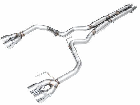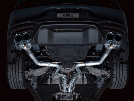 Presenting the AWE Cat Back Exhaust for the Ford S650 Mustang GT. You’re looking at the Track Edition - the rowdiest version of the lineup. The AWE Track Edition has minimal filter in the rear via dual straight lengths of 3” stainless steel - it’s light, it’s loud (in & out), it’s cost-effective, and it isn’t for the faint of heart–you’ve been warned (and for this reason, the Track Edition can not be returned for sound reasons!). Full 3” & modular, the Track Edition features a full 3” design with modular, slip-fit inlet adapters for perfect mating with the factory headers, while facilitating a dual 3” connection for drivers looking to get spicier upstream one day (or now). And thanks to the precision AWE H-pipe, your 5.0L V8 will produce a deep, rich muscle tone with minimal wrasp (unlike an X-pipe). The Track Edition features straight-through bullet-style resonators in the mid pipes to further defeat wrasp, which becomes especially helpful should you upgrade your headers. When it comes to power to the pavement, we’re looking at dyno-verified gains of +12 hp and +10 lb-ft of torque at the wheels on an otherwise stock vehicle. The full AWE Track Edition is 100% emission-friendly, not interfering with any factory emissions equipment. Bringing up the rear are quad 4.5” slash-cut, double-walled, and individually adjustable tips, available in chrome silver or diamond black. Made in PA, USA: engineered, designed, and manufactured in-house at AWE using US-sourced .065”-wall T304L stainless steel. All this plus 50 state emissions compliance, AWE’s Fitment Guarantee, No Check Engine Light Guarantee, and the AWE Lifetime Warranty.