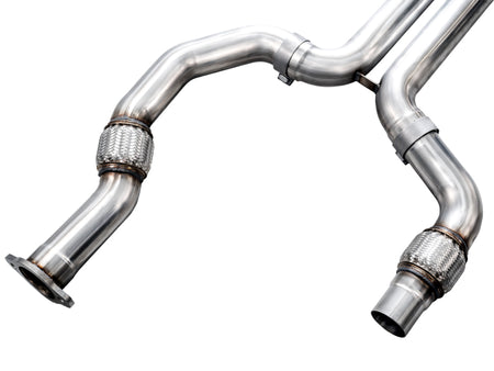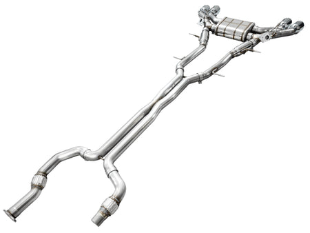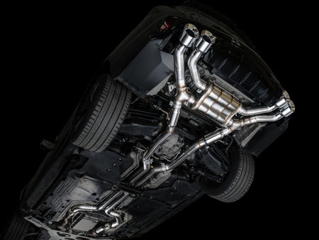 A dual 3" catback configuration constructed of US-sourced T304L stainless steel featuring a bespoke AWE X-pipe to harness the V6TT, patented drone-canceling 180 Technology®, full factory valve functionality, and rigidity where it matters most, all topped with quad double-walled, slash-cut tips in chrome silver. This is the do-it-all exhaust for the Cadillace CT4-V Blackwing.