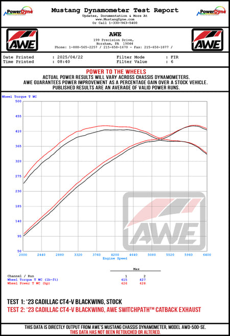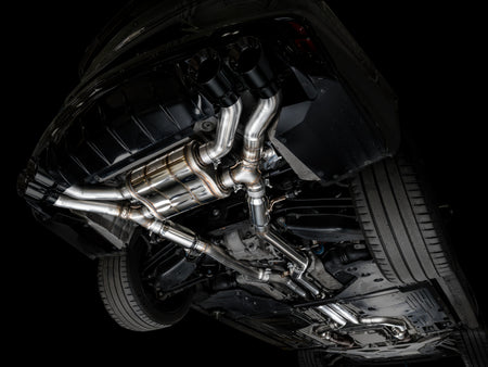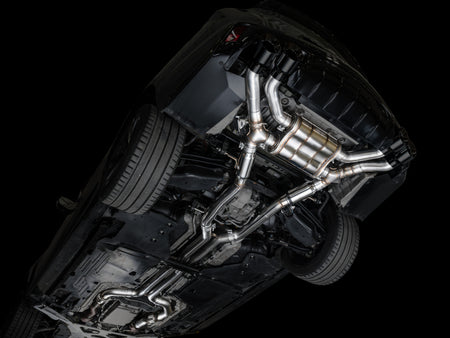 A dual 3" catback configuration constructed of US-sourced T304L stainless steel featuring a bespoke AWE X-pipe to harness the V6TT, patented drone-canceling 180 Technology®, full factory valve functionality, and rigidity where it matters most, all topped with quad double-walled, slash-cut tips in diamond black. This is the do-it-all exhaust for the Cadillace CT4-V Blackwing.