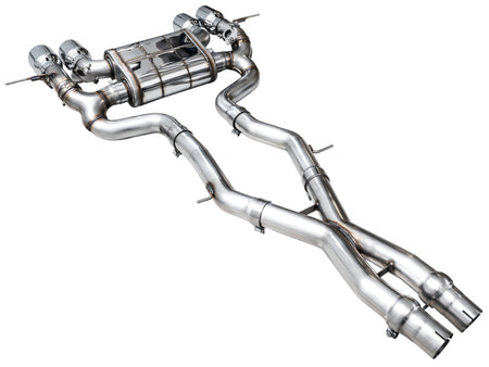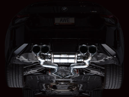 The AWE SwitchPath™ Exhaust is comprised of 3-inch U.S.-sourced T304L stainless steel, a precision x-pipe, and a valved SwitchPath™ muffler tuned for the S58. Beginning after the factory mid pipe, the precision X-pipe immediately cures the S58 of its rasp, deepening the tone before it's refined further by the bespoke SwitchPath™ muffler. When the valves are closed, the SwitchPath™ produces a refined, aggressive howl while remaining full-bodied and powerful – no congested, metallic sounds when you're on it. At cruising, interior acoustics are close to stock with no drone. AWE SwitchPath™ tech responds perfectly to the many transmission settings and shift points of the G87. Drop the hammer with the valves closed and SwitchPath™ sings a proper M anthem. If you were to leave the valves closed at all times after equipping SwitchPath™, we wouldn’t blame you — it’s that good… all of the time. Open the valves and the S58’s roar is uncorked. Sport and Sport+ modes achieve the ultimate contrast in behavior when compared to comfort driving modes (aka valves closed). In Sport mode, the exhaust note is powerful, clean, and aggressive. In Sport+ mode, the same aggression applies… but with grin-provoking burbles. Thanks to the precision X-pipe, the rasp is still kept in check while allowing the exhaust note to reach full aggression. The AWE SwitchPath™ comes with quad 4.5” double-walled, slash-cut tips available in chrome silver or diamond black. The exhaust also features inlet adapters to mate to the factory mid-section. When pairing AWE Mid-Pipes to the SwitchPath™ or Track Edition Exhausts, these adapters are not needed. Due to varying cut points, AWE Exhausts are not guaranteed to mate with another manufacturer’s mid pipes. AWE's No CEL Guarantee, Perfect Fitment Guarantee, and Lifetime Warranty come standard.