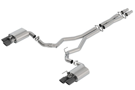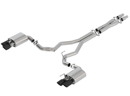 System will fit Bullitt models. NOT recommended for use on Convertibles. This 3" diameter high flow Cat-Back(tm) system was designed specifically for the Mustang GT has Active Exhaust Valves. The system features a Merge X-Pipe for increased performance and improved sound. The system has Borla(r)'s Polyphonic Exhaust Harmonizer which utilizes patented units that contain pipes of different diameters and lengths to create multiple exhaust notes that harmonize to deliver a clean, rich, full-bodied sound to the Borla(r) mufflers. The mufflers then enhance this sound to the character and volume of the aggressive ATAK(r) sound, with no drone inside the vehicle. The exhaust exits thru dual 4" round black chrome on T-304 stainless steel tips on each muffler. Using Borla(r) Stainless Steel Polish p# 21461 is System will fit Bullitt models. NOT recommended with these black chrome tips. We suggest cleaning the tips with hot water and a microfiber cloth. Borla(r) Cat-Back(tm) and Axle-Back exhaust systems feature patented straight-through and multi-core technology designed to unleash hidden horsepower. Increased exhaust velocity adds power, driving excitement, fuel economy, and the distinctive Borla(r) Sound of Power respected by motoring enthusiasts everywhere. Each system is built from premium T-304 stainless steel, superior to T-400 series knockoffs (such as 409), to give you the absolute best in performance and durability. Ultra-smooth mandrel bends ensure maximum flow & power, and precision computer numerical control (CNC) manufacturing ensures an accurate fit. Best of all, Borla(r) stands behind every system with a Million-Mile Warranty. Just what you'd expect from the world's most experienced (and most winning) exhaust brand.