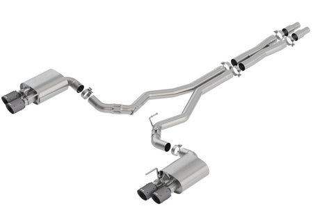 System will fit Bullitt models. NOT recommended for use on Convertibles. This 3" diameter high flow Cat-Back(tm) system was designed specifically for the Mustang GT and has Active Exhaust Valves. The system contains a Merge X-Pipe for increased performance and improved sound. The system has Borla(r)'s Polyphonic Exhaust Harmonizer Technology with utilizes patented units that contain pipes of different diameters and lengths to create multiple exhaust notes that harmonize to deliver a clean, rich, full-bodied sound to the Borla(r) mufflers. The mufflers then enhance this sound to the character and volume of the aggressive ATAK(r) sound, with no drone inside the vehicle. The exhaust exits thru dual 4" round carbon fiber with black anodized center tips on each muffler. Systems with bright chrome on T-304 stainless steel tips, and black chrome on T-304 stainless steel tips are also available. Borla(r) Cat-Back(tm) and Axle-Back multi-core technology is designed to unleash hidden horsepower. Increased exhaust velocity adds power, driving excitement, fuel economy, and the distinctive Borla(r) Sound of Power respected by motoring enthusiasts everywhere. Each system is built from premium T-304 stainless steel, superior to T-400 series knockoffs (such as 409), to give you the absolute best in performance and durability. Ultra-smooth mandrel bends ensure maximum flow & power, and precision computer numerical control (CNC) manufacturing ensures an accurate fit. Best of all, Borla(r) stands behind every system with a Million-Mile Warranty. Just what you'd expect from the world's most experienced (and most winning) exhaust brand.