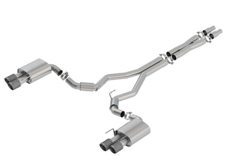 WITHOUT Active Valve Exhaust. NOT recommended for use on Convertibles. 3" diameter system. System contains a merge X-Pipe for increased performance and improved sound. Features 4" carbon fiber tips with bright centers. Borla(r) Cat-Back(tm) and Axle-Back exhaust systems feature patented straight-through and multi-core technology designed to unleash hidden horsepower. Increased exhaust velocity adds power, driving excitement, fuel economy, and the distinctive Borla(r) Sound of Power respected by motoring enthusiasts everywhere. Each system is built from premium T-304 stainless steel, superior to T-400 series knockoffs (such as 409), to give you the absolute best in performance and durability. Ultra-smooth mandrel bends ensure maximum flow & power, and precision computer numerical control (CNC) manufacturing ensures an accurate fit. Best of all, Borla(r) stands behind every system with a Million-Mile Warranty. Just what you'd expect from the world's most experienced (and most winning) exhaust brand.