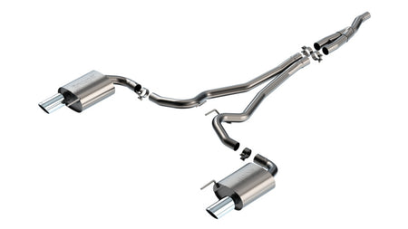 This 2.5" diameter Borla(r) Cat-Back(tm) system is designed for use on EcoBoost cars WITHOUT the Active Exhaust feature. It features the classic S-Type sound with no drone inside the vehicle and single 4" round bright chrome on T-304 stainless steel tips on each muffler assembly. Systems with black chrome on T-304 stainless steel tips, and carbon fiber tips are also available. Borla(r) Cat-Back(tm) and Axle-Back exhaust systems feature patented straight-through and multi-core technology designed to unleash hidden horsepower. Increased exhaust velocity adds power, driving excitement, fuel economy, and the distinctive Borla(r) Sound of Power respected by motoring enthusiasts everywhere. Each system is built from premium T-304 stainless steel, superior to T-400 series knockoffs (such as 409), to give you the absolute best in performance and durability. Ultra-smooth mandrel bends ensure maximum flow & power, and precision computer numerical control (CNC) manufacturing ensures an accurate fit. Best of all, Borla(r) stands behind every system with a Million-Mile Warranty. Just what you'd expect from the world's most experienced (and most winning) exhaust brand.