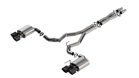 This Borla(r) Cat-Back(tm) system was designed specifically for the Mustang Dark Horse. 3" diameter True Dual system for high flow. System contains a merge X-Pipe for increased performance and improved sound. System has Active Valve Exhaust valves. System features Borla(r) 's Polyphonic Exhaust Harmonizer Technology which utilizes patented units that contain pipes of different diameters and lengths to create multiple exhaust notes that harmonize to deliver a clean, rich, full-bodied sound. System features the aggressive ATAK(r) sound with no drone inside the vehicle and 5" carbon fiber with black anodized center tips. Systems with bright chrome on T-304 stainless steel tips, and black chrome on T-304 stainless steel tips are also available. Borla(r) Cat-Back(tm) and Axle-Back multi-core technology is designed to unleash hidden horsepower. Increased exhaust velocity adds power, driving excitement, fuel economy, and the distinctive Borla(r) Sound of Power respected by motoring enthusiasts everywhere. Each system is built from premium T-304 stainless steel, superior to T-400 series knockoffs (such as 409), to give you the absolute best in performance and durability. Ultra-smooth mandrel bends ensure maximum flow & power, and precision computer numerical control (CNC) manufacturing ensures an accurate fit. Best of all, Borla(r) stands behind every system with a Million-Mile Warranty. Just what you'd expect from the world's most experienced (and most winning) exhaust brand.