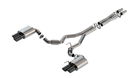 This 3" diameter True Dual Quad Tip Borla(r) Cat-Back(tm) system features a merge X-Pipe for increased performance and improved sound. This system features the classic S-Type sound with no drone inside the vehicle and 4" black chrome on T-304 stainless steel tips, and is for vehicles WITHOUT the Active Exhaust feature. Using Borla(r) Stainless Steel Polish p# 21461 is NOT recommended with these black chrome tips. We suggest cleaning the tips with hot water and a microfiber cloth. Systems with bright chrome on T-304 stainless steel tips, and carbon fiber tip sare also available. If your car has 1 tip on each muffler and you want to upgrade it to 2 tips on each muffler (also know as quad tips), this is the system for you. It is designed to work with the quad tip (2 tips per muffler) O.E. Ford Valance ONLY. If you want to install this system on a vehicle that came with one tip per muffler you will NEED TO BUY and install a different valance. Ford quad tip valance part numbers: With Parking Sensors = PR3Z-17F828-DA, Without Parking Sensors = PR3Z-17F828-CA. Borla(r) Cat-Back(tm) and Axle-Back exhaust systems feature patented straight-through and multi-core technology designed to unleash hidden horsepower. Increased exhaust velocity adds power, driving excitement, fuel economy, and the distinctive Borla(r) Sound of Power respected by motoring enthusiasts everywhere. Each system is built from premium T-304 stainless steel, superior to T-400 series knockoffs (such as 409), to give you the absolute best in performance and durability. Ultra-smooth mandrel bends ensure maximum flow & power, and precision computer numerical control (CNC) manufacturing ensures an accurate fit. Best of all, Borla(r) stands behind every system with a Million-Mile Warranty. Just what you'd expect from the world's most experienced (and most winning) exhaust brand.