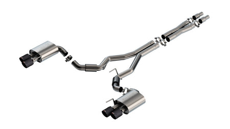 This 3" diameter True Dual Quad tip Borla(r) Cat-Back(tm) system features a merge X-Pipe for increased performance and improved sound. This system features the classic S-Type sound with no drone inside the vehicle and 4" carbon fiber tips, and is for vehicles WITHOUT the Active Exhaust feature. Systems with bright chrome on T-304 stainless steel tips, and black chrome on T-304 stainless steel tips are also available. If your car has 1 tip on each muffler and you want to upgrade it to 2 tips on each muffler (also know as quad tips), this is the system for you. It is designed to work with the quad tip (2 tips per muffler) O.E. Ford Valance ONLY. If you want to install this system on a vehicle that came with one tip per muffler you will need to buy and install a different valance. Ford quad tip valance part numbers: With Parking Sensors = PR3Z-17F828-DA, Without Parking Sensors = PR3Z-17F828-CA. Borla(r) Cat-Back(tm) and Axle-Back exhaust systems feature patented straight-through and multi-core technology designed to unleash hidden horsepower. Increased exhaust velocity adds power, driving excitement, fuel economy, and the distinctive Borla(r) Sound of Power respected by motoring enthusiasts everywhere. Each system is built from premium T-304 stainless steel, superior to T-400 series knockoffs (such as 409), to give you the absolute best in performance and durability. Ultra-smooth mandrel bends ensure maximum flow & power, and precision computer numerical control (CNC) manufacturing ensures an accurate fit. Best of all, Borla(r) stands behind every system with a Million-Mile Warranty. Just what you'd expect from the world's most experienced (and most winning) exhaust brand.