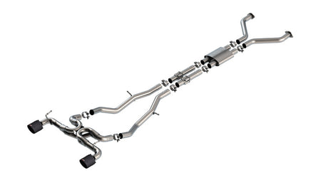 • This system is a True Dual design that features a Resonator with an Internal H-Pipe, Polyphonic Harmonizer technology, and SwitchFire(r) technology. All of these features combine to create the aggressive ATAK(r) sound. It provides a more exciting driving experience without any drone. The Merge X-Pipe blends the combustion pulses from both sides of the engine for improved performance and a custom sound. Borla(r)'s Polyphonic Harmonizer Technology utilizes patented units that contain pipes of different diameters and lengths to create multiple exhaust notes that harmonize to deliver a clean, rich, full-bodied sound. Borla(r)'s patented SwitchFire(r) design further blends the combustion gases and sound waves. 4.5" carbon fiber with black anodized center tips provide a custom appearance. Systems with polished phantom style T-304 stainless steel tips are also available. Borla(r) Cat-Back(tm) exhaust systems feature patented technology to unleash hidden horsepower. Increased exhaust velocity adds power, driving excitement, fuel economy, and the distinctive Borla(r) Sound of Power respected by motoring enthusiasts everywhere. Each system is built from premium, high-quality T-304 austenitic stainless steel, superior to T-400 series knockoffs (such as 409), to give you the absolute best in performance and durability. Ultra-smooth mandrel bends ensure maximum flow & power, and precision computer numerical control (CNC) manufacturing ensures an accurate fit. Best of all, Borla(r) stands behind every system with a Million-Mile Warranty. Just what you'd expect from the world's most experienced (and most winning) exhaust brand. System Features: