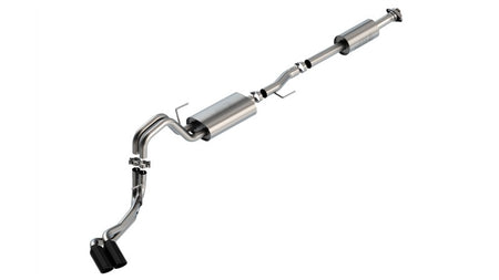 The 3" into dual 2.25" Borla(r) Cat-Back(tm) system was specifically designed to enhance the power and sound of the Ford F-150 equipped with 2.7L and 3.5L engines. The dual side (passenger side) exit configuration replaces the single factory tail pipe, and has single 4" round black chrome T-304 stainless steel tips on each tail pipe. Using Borla(r) Stainless Steel Polish p# 21461 is NOT recommended with these black chrome tips. We suggest cleaning the tips with hot water and a microfiber cloth. A system with bright chrome on T-304 stainless steel tips is also available. This system features the mellow Touring sound that gives you a mild sound of power with no drone. Additional systems are available with different options for sound level, tip finish and tip exits. Add Adapter 60556 for Crew Cab with Standard Bed (6' 7") 157.2" Wheelbase vehicles. Add Adapter 60564 for Extended Cab with Long Bed (8' 2") 164.1" Wheelbase vehicles. Borla(r) Cat-Back(tm) & Axle-Back exhaust systems feature patented straight-through and multi-core technology to unleash hidden horsepower. Increased exhaust velocity adds power, driving excitement, fuel economy, and the distinctive Borla(r) Sound of Power respected by motoring enthusiasts everywhere. Each system is built from premium, high-quality T-304 austenitic stainless steel, superior to T-400 series knockoffs (such as 409), to give you the absolute best in performance and durability. Ultra-smooth mandrel bends ensure maximum flow & power, and precision computer numerical control (CNC) manufacturing ensures an accurate fit. All this is backed by our unsurpassed Million Mile Warranty. System Features: Cat-Back(tm) System Dual Side Exit 4" Round Black Chrome On T-304 Stainless Steel Tips Touring Sound Level T-304 Stainless Steel Construction Bolt-On Installation Million Mile Warranty