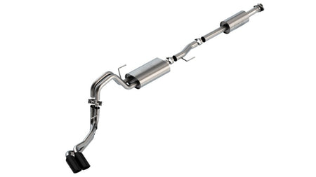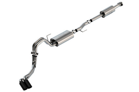 The 3" diameter into dual 2.25" Borla(r) Cat-Back(tm) system was specifically designed to enhance the power and sound of the Ford F-150 equipped with 3.3L engine. It has a dual side (passenger side) exit configuration with single 4" round black chrome on T-304 stainless steel tips on each tail pipe. Using Borla(r) Stainless Steel Polish p# 21461 is NOT recommended with these black chrome tips. We suggest cleaning the tips with hot water and a microfiber cloth. A system with bright chrome on T-304 stainless steel tips is also available. This system features the aggressive ATAK(r) sound with no drone. Additional systems are available with different options for sound level, tip finish and tip exits. Add adapter 60556 for Crew Cab with Standard Bed (6' 7") 157.2" Wheelbase vehicles. Add adapter 60564 for Extended Cab with Long Bed (8' 2") 164.1" Wheelbase vehicles. Borla(r) Cat-Back(tm) & Axle-Back exhaust systems feature patented straight-through and multi-core technology to unleash hidden horsepower. Increased exhaust velocity adds power, driving excitement, fuel economy, and the distinctive Borla(r) Sound of Power respected by motoring enthusiasts everywhere. Each system is built from premium, high-quality T-304 stainless steel, to give you the absolute best in performance and durability. Ultra-smooth mandrel bends ensure maximum flow & power, and computer numerical control (CNC) manufacturing ensures an accurate fit. All this is backed by our unsurpassed Million Mile Warranty. System Features: Cat-Back(tm) System Dual Side Exit 4" Round Black Chrome On T-304 Stainless Steel Tips ATAK(r) Sound Level T-304 Stainless Steel Construction Bolt-On Installation Million Mile Warranty