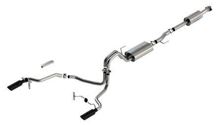 The 3" diameter into dual 2.25" Borla(r) Cat-Back(tm) system was specifically designed to enhance the power and sound of the Ford F-150 equipped with 3.3L engine. The split rear exit configuration replaces the single factory tail pipe, and has single 4" round black chrome on T-304 stainless steel tips on each tail pipe. Using Borla(r) Stainless Steel Polish p# 21461 is NOT recommended with these black chrome tips. We suggest cleaning the tips with hot water and a microfiber cloth. A system with bright chrome on T-304 stainless steel tips is also available. This system features the aggressive ATAK(r) sound with no drone. Additional systems are available with different options for sound level, tip finish and tip exits. Add adapter 60556 for Crew Cab with Standard Bed (6' 7") 157.2" Wheelbase vehicles. Add adapter 60564 for Extended Cab with Long Bed (8' 2") 164.1" Wheelbase vehicles. Borla(r) Cat-Back(tm) & Axle-Back exhaust systems feature patented straight-through and multi-core technology to unleash hidden horsepower. Increased exhaust velocity adds power, driving excitement, fuel economy, and the distinctive Borla(r) Sound of Power respected by motoring enthusiasts everywhere. Each system is built from premium, high-quality T-304 stainless steel, to give you the absolute best in performance and durability. Ultra-smooth mandrel bends ensure maximum flow & power, and computer numerical control (CNC) manufacturing ensures an accurate fit. All this is backed by our unsurpassed Million Mile Warranty. System Features: Cat-Back(tm) System Split Rear Exit 4" Round Black Chrome On T-304 Stainless Steel Tips ATAK(r) Sound Level T-304 Stainless Steel Construction Bolt-On Installation Million Mile Warranty
