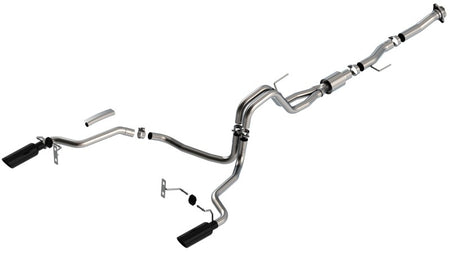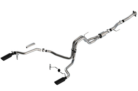 The 3" diameter into dual 2.25" Borla(r) Cat-Back(tm) system 14086 was specifically designed to enhance the power and sound of the Ford F-150 equipped with the 5.0L V8 engine. The split rear exit configuration replaces the single factory tail pipe, and has single 4" round black chrome on T-304 stainless steel tips on each tail pipe. Using Borla(r) Stainless Steel Polish p# 21461 is NOT recommended with these black chrome tips. We suggest cleaning the tips with hot water and a microfiber cloth. A system with bright chrome on T-304 stainless steel tips is also available. This system features the aggressive ATAK(r) sound with no drone. Additional systems are available with different options for sound level, tip finish and tip exits. Add adapter 60564 for Regular Cab with Long Bed (8') 141.5" wheelbase vehicles. Borla(r) Cat-Back(tm) & Axle-Back exhaust systems feature patented straight-through and multi-core technology to unleash hidden horsepower. Increased exhaust velocity adds power, driving excitement, fuel economy, and the distinctive Borla(r) Sound of Power respected by motoring enthusiasts everywhere. Each system is built from premium, high-quality T-304 austenitic stainless steel, superior to T-400 series knockoffs (such as 409), to give you the absolute best in performance and durability. Ultra-smooth mandrel bends ensure maximum flow & power, and precision computer numerical control (CNC) manufacturing ensures an accurate fit. All this is backed by our unsurpassed Million Mile Warranty. System Features: Cat-Back(tm) System Split Rear Exit 4" Round Black Chrome On T-304 Stainless Steel Tips ATAK(r) Sound Level T-304 Stainless Steel Construction Bolt-On Installation Million Mile Warranty
