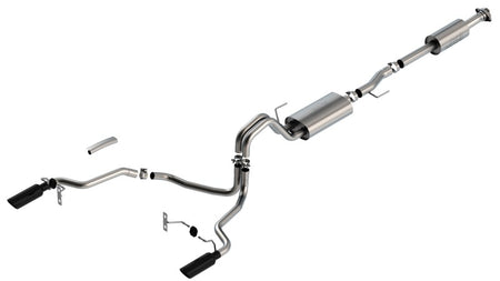 The 3" into dual 2.25" diameter Borla(r) Cat-Back(tm) system was specifically designed to enhance the power and sound of the Ford F-150 equipped with the 5.0L V8 engine. The split rear exit configuration replaces the single factory tail pipe, and has single 4" round black chrome on T-304 stainless steel tips on each tail pipe. Using Borla(r) Stainless Steel Polish p# 21461 is NOT recommended with these black chrome tips. We suggest cleaning the tips with hot water and a microfiber cloth. A system with bright chrome on T-304 stainless steel is also available. This system features the mellow Touring sound that gives you a mild sound of power with no drone. Additional systems are available with different options for sound level, tip finish and tip exits. Add adapter 60556 for Crew Cab with Standard Bed (6' 7') 157.2" Wheelbase vehicles. Add adapter 60564 for Extended Cab with Long Bed (8' 2") 164.1" Wheelbase vehicles. Borla(r) Cat-Back(tm) & Axle-Back exhaust systems feature patented straight-through and multi-core technology to unleash hidden horsepower. Increased exhaust velocity adds power, driving excitement, fuel economy, and the distinctive Borla(r) Sound of Power respected by motoring enthusiasts everywhere. Each system is built from premium, high-quality T-304 austenitic stainless steel, superior to T-400 series knockoffs (such as 409), to give you the absolute best in performance and durability. Ultra-smooth mandrel bends ensure maximum flow & power, and precision computer numerical control (CNC) manufacturing ensures an accurate fit. All this is backed by our unsurpassed Million Mile Warranty. System Features: Cat-Back(tm) System Split Rear Exit 4" Round Black Chrome On T-304 Stainless Steel Tips Touring Sound Level T-304 Stainless Steel Construction Bolt-On Installation Million Mile Warranty
