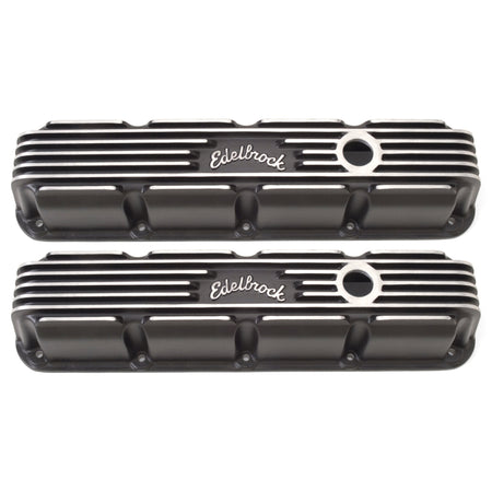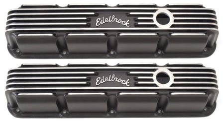Edelbrock part #41773 Classic Series Valve Covers are designed for Chrysler Small-Block Magnum applications and have a Black finish. Edelbrock first made these aluminum valve covers in the late '50s and they're still a classic. Made of heavy-gauge sand-cast aluminum, Overall height is measured from base to top at the highest point. Edelbrock classic valve covers can be machined to accept breathers if desired.