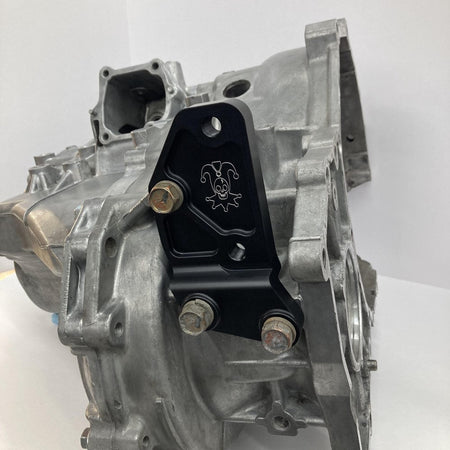 This billet aluminum bracket bolts to the rear of the transmission and replaces the factory cast iron piece, shaving off almost 1.5lbs from the front of the vehicle.