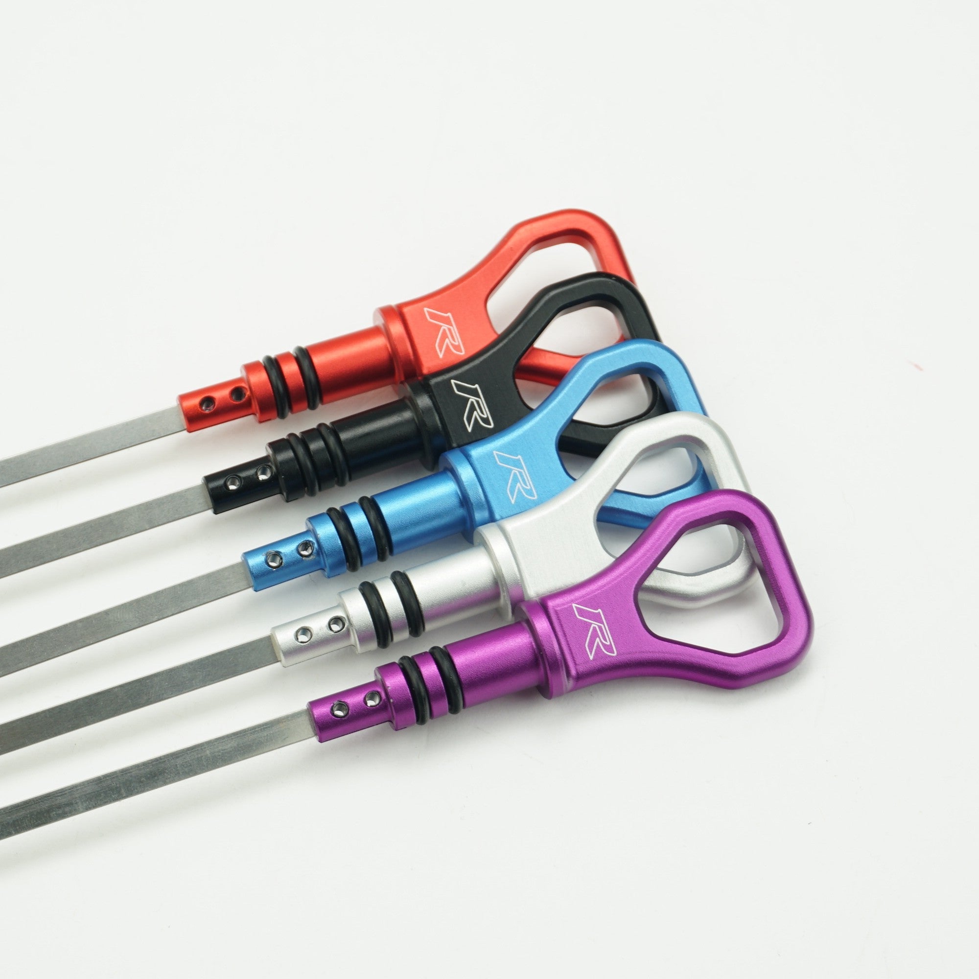 We've resolved that issue and more with our dipstick! It uses an all metal stick with traditional markings on the metal for high and low level points as well as a grid pattern to retain oil making level reading a the quick easy task it should be. Not only that but the dorky orange plastic handle of the factory dipstick is also gone and in its place is our billet aluminum handle! Available in your choice of red, purple, blue, black or silver, it really helps set off your engine bay aesthetics!