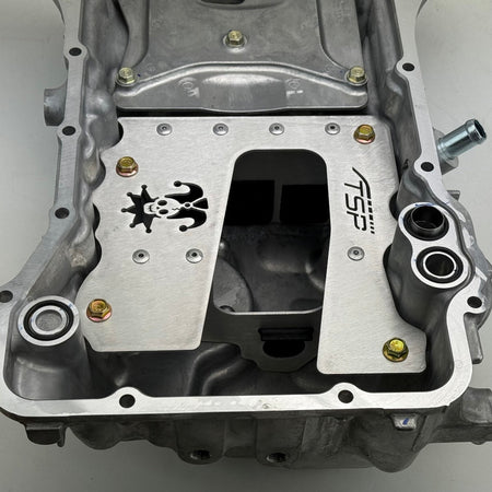 To install our oil pan baffle the factory rivets must be removed and the pan drilled and tapped for M6x1.0 bolts. It comes with everything needed to install into your pan other than a drill bit, thread tap (5mm drill bit needed), and RTV to seal the pan to the block.