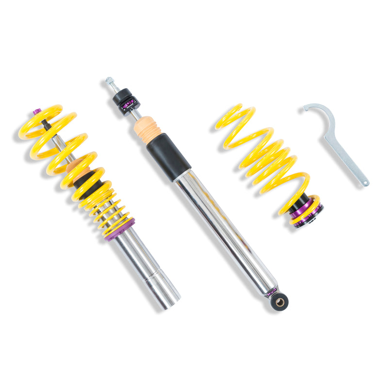 Cutting-edge motorsports technology for more performance on the road. Like every suspension product developed by KW automotive, the suspension manufacturer, and manufactured in Germany, the KW V3 Coilover suspension kit also provides a significant plus in safety reserves in road traffic. Thanks to the chassis with its high-quality dampers, springs, and elastomer spring elements, pitching and rolling movements during load changes such as evasive maneuvers, cornering, acceleration, and braking are significantly reduced. The braking distances are also shortened. Thanks to improved support and feedback, drivers not only feel safer but driving in everyday life becomes even safer. With compression and rebound stage damping, that can be set separately and independently of each other, the damper setup can be customized to your personal driving preferences or vehicle changes such as weight, tire characteristics, or altered vehicle rigidity. True performance optimization is only possible with this unique, patented system. For example, this allows the compression damping force to be increased and get more grip from the tires, to improve cornering behavior and reduce squat without simultaneously altering the rebound stage damping which is optimally matched to the spring rate, a scenario which results in reduced grip and the associated loss of performance. The KW V3 coilover kit is the ideal tool for performance-oriented drivers and experienced tuning enthusiasts who place a strong emphasis on the overall performance of their suspension. The Variant 3 features patented TVR-A and TVC-A technology that provides separately adjustable rebound and compression damping. The extensive adjustment range of the independently configurable rebound and compression make it easy to directly influence the steering behavior, directional stability, grip and handling characteristics for confident and repeatable results at the limit of driving dynamics.
