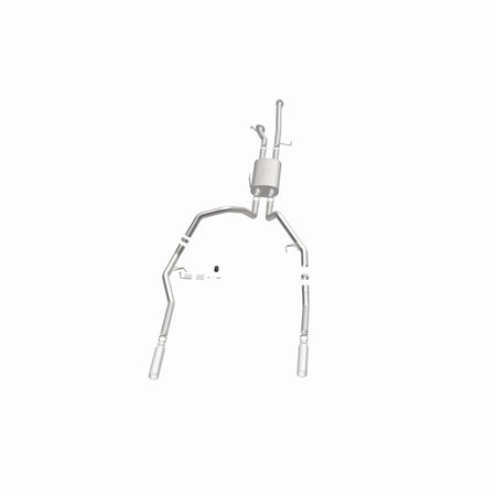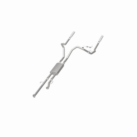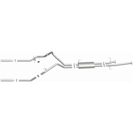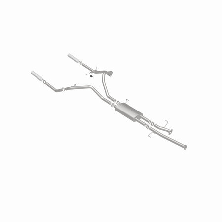 The MagnaFlow 2014-2021 Toyota Tundra Street Series Cat-Back Performance Exhaust System brings out the personality of your 4.6L, 5.7L 2014-2021 Toyota Tundra with our signature resonant, powerful engine tone and dyno-proven performance. Thanks to its fast-flowing, mandrel bent 2.5in. main piping and 1 Straight-Through mufflers ending in a Dual Split Rear exit with 3.5in. Polished Clamp-On Single Wall Angle Cut Rolled Edge tips, this Toyota Tundra exhaust kit has the performance chops to match its sporty sound and appearance. Upgrade your ride to the next level with an exhaust that has the pipes to put other Toyota Tundra's to shame. With this system your vehicle will be producing Aggressive exterior and Moderate interior sound levels while leaving other cars and trucks feeling envious at every stoplight. Exhaust kit 15305 features a cat-back layout that replaces your ride's stock exhaust components from near the catalytic converter on back. Extensive 3D scanning during development has resulted in a direct-fit design that you can easily install yourself. 15305 is produced using CNC precision robotic manufacturing techniques and is backed by MagnaFlow's 1-year limited finish warranty and limited lifetime construction warranty.