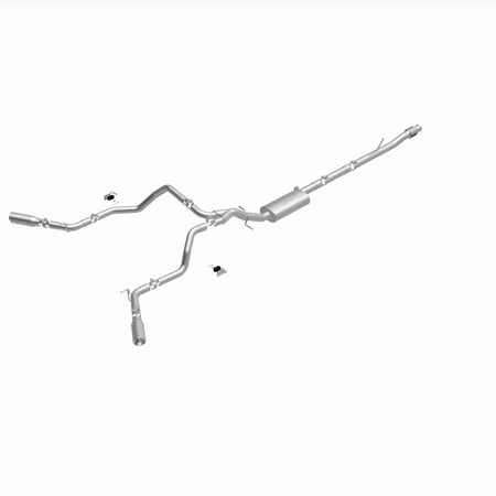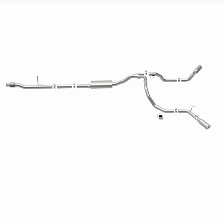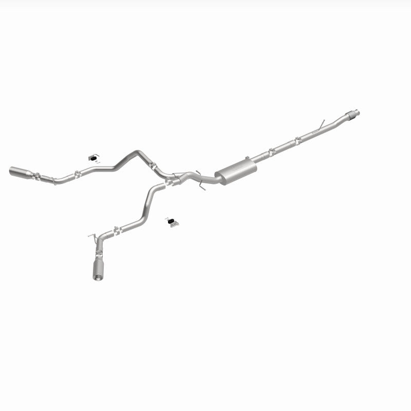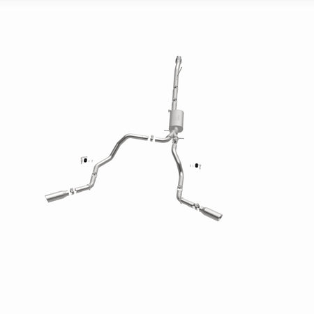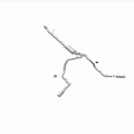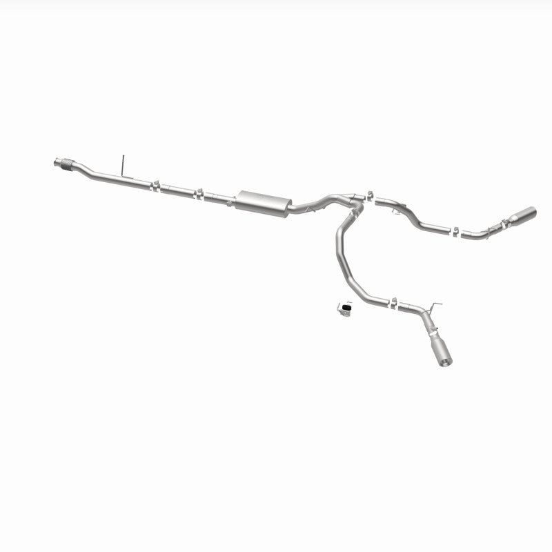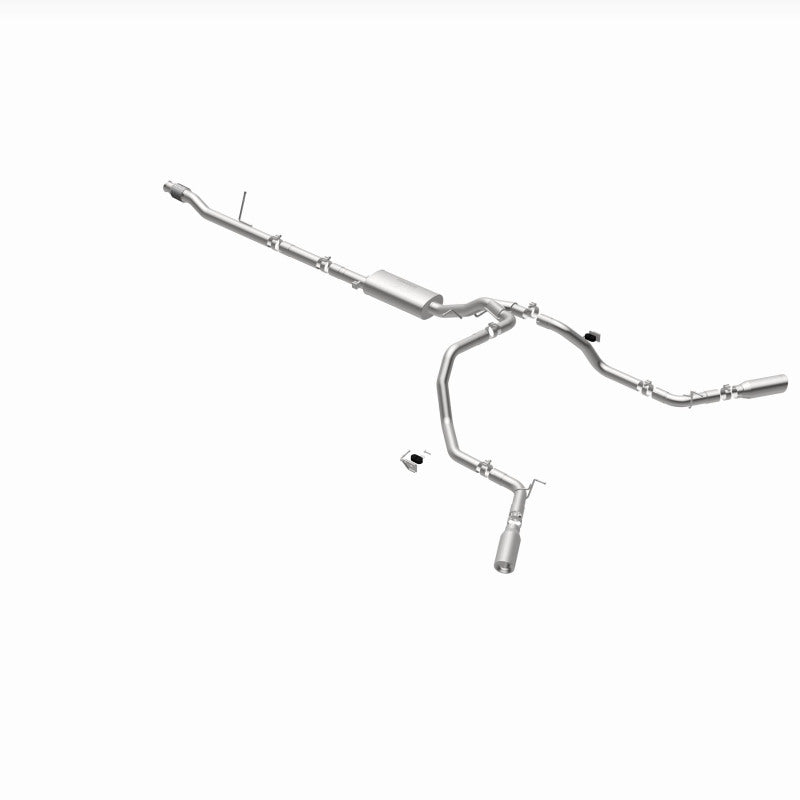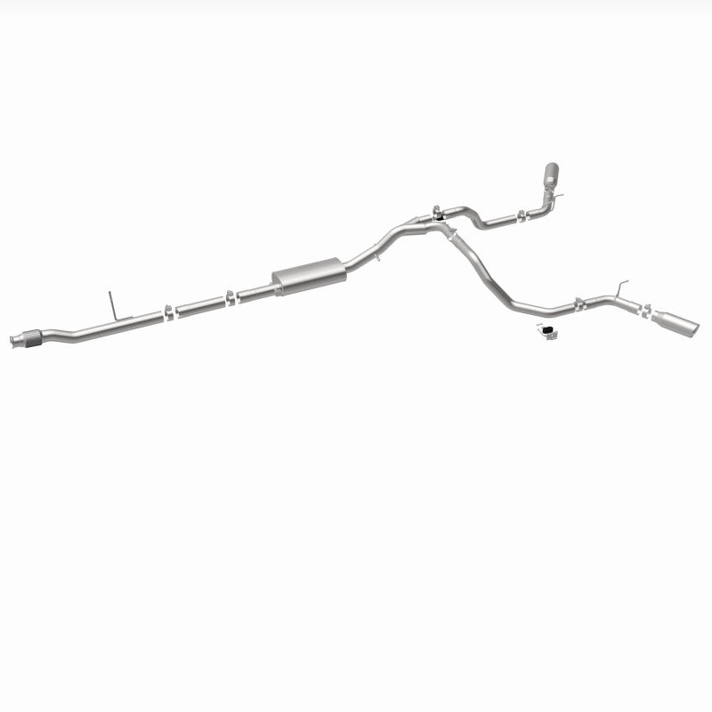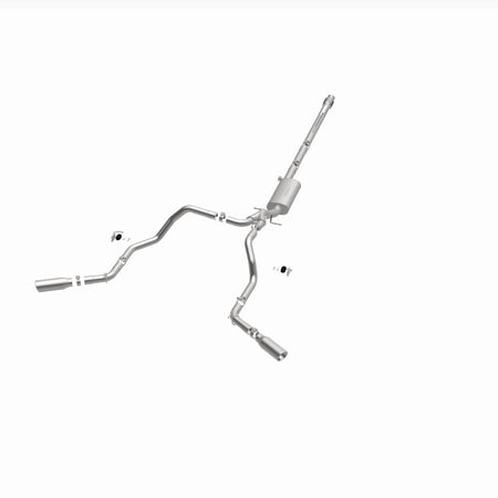 The MagnaFlow Street Series Cat-Back Performance Exhaust System 19473 brings out the personality of your Truck with our signature resonant, powerful engine tone and dyno-proven performance. Thanks to its fast-flowing, mandrel bent 3in. main piping and 1 Straight-Through mufflers ending in a Dual Split Rear Behind Rear Tires exit with 4in. Polished Clamp-On Double Wall Angle Cut Rolled Edge tips, this Truck exhaust kit has the performance chops to match its sporty sound and appearance. Upgrade your ride to the next level with an exhaust that has the pipes to put other Truck's to shame. With this system your vehicle will be producing Aggressive exterior and Moderate interior sound levels while leaving other cars and trucks feeling envious at every stoplight. Exhaust kit 19473 features a cat-back layout that replaces your ride's stock exhaust components from near the catalytic converter on back. Extensive 3D scanning during development has resulted in a direct-fit design that you can easily install yourself. 19473 is produced using CNC precision robotic manufacturing techniques and is backed by MagnaFlow's 1-year limited finish warranty and limited lifetime construction warranty.