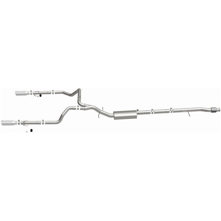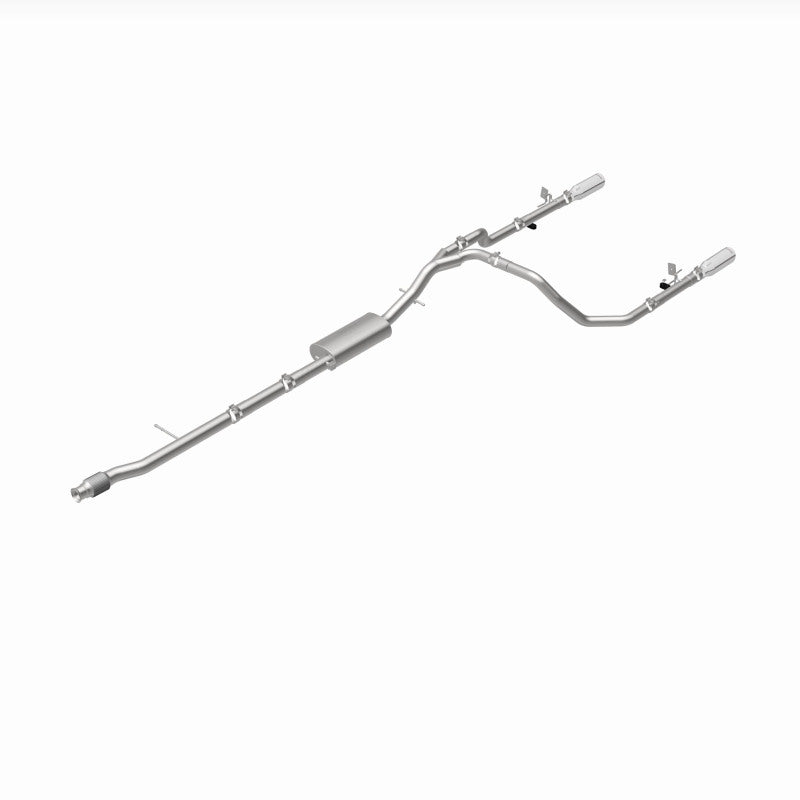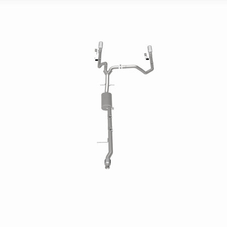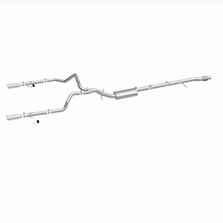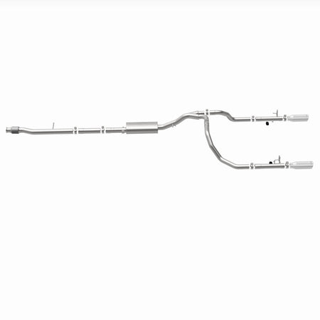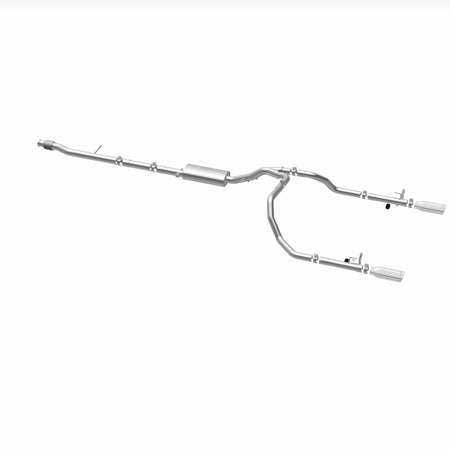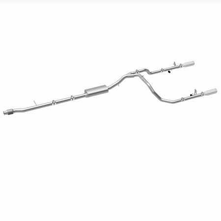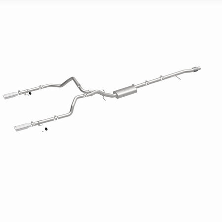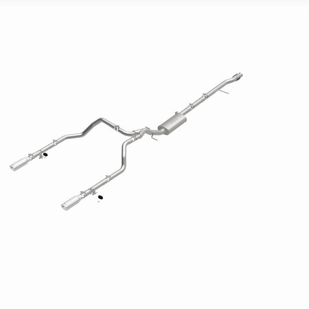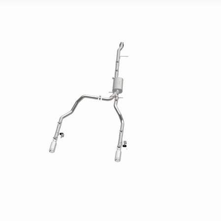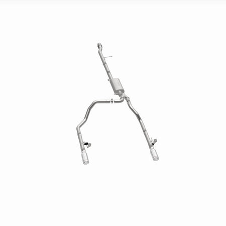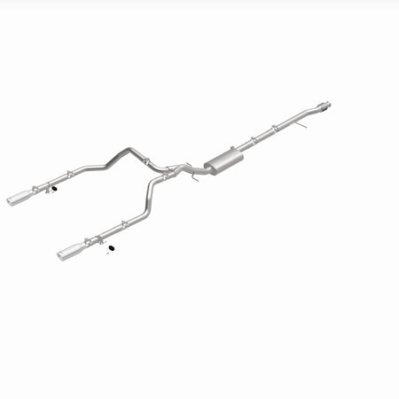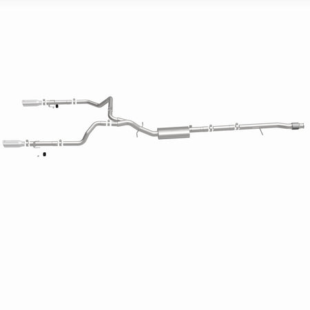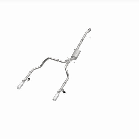 The MagnaFlow Street Series Cat-Back Performance Exhaust System 19471 brings out the personality of your Truck with our signature resonant, powerful engine tone and dyno-proven performance. Thanks to its fast-flowing, mandrel bent 3in. main piping and 1 Straight-Through mufflers ending in a Dual Split Rear exit with 4in. Polished Welded-On Double Wall Angle Cut Rolled Edge tips, this Truck exhaust kit has the performance chops to match its sporty sound and appearance. Upgrade your ride to the next level with an exhaust that has the pipes to put other Truck's to shame. With this system your vehicle will be producing Aggressive exterior and Moderate interior sound levels while leaving other cars and trucks feeling envious at every stoplight. Exhaust kit 19471 features a cat-back layout that replaces your ride's stock exhaust components from near the catalytic converter on back. Extensive 3D scanning during development has resulted in a direct-fit design that you can easily install yourself. 19471 is produced using CNC precision robotic manufacturing techniques and is backed by MagnaFlow's 1-year limited finish warranty and limited lifetime construction warranty.