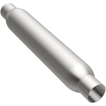 The MagnaFlow 3.5in. Round Glasspack Performance Exhaust Muffler 18125 enhances your ride with the deep, classic sound that glasspack mufflers are known for. The round muffler body features a free-flowing reversible straight-through 2.25/2.25in. diameter configuration and single stage packing with a satin finish. This weight-optimized glasspack muffler is engineered to bring out the inner hot rod in your ride with plenty of volume and dyno-proven performance, so please check to ensure compliance with local noise regulations. 18125 offers flexibility when it comes to installation thanks to its universal design, however, professional installation is recommended. Muffler 18125 is made of corrosion resistant aluminized steel and produced using CNC precision robotic manufacturing techniques, all backed by MagnaFlow's 90-day limited construction warranty.
