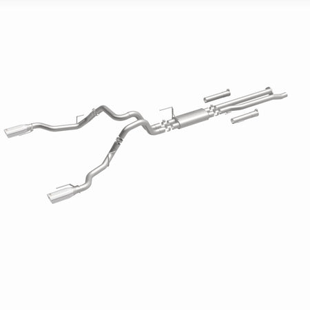 The MagnaFlow 2017-2020 Ford F-150 Street Series Cat-Back Performance Exhaust System brings out the personality of your 3.5L 2017-2020 Ford F-150 with our signature resonant, powerful engine tone and dyno-proven performance. Thanks to its fast-flowing, mandrel bent 3in. main piping and 1 Straight-Through mufflers ending in a Dual Split Rear exit with 5in. Polished Welded-On Double Wall Angle Cut Rolled Edge tips, this Ford F-150 exhaust kit has the performance chops to match its sporty sound and appearance. Upgrade your ride to the next level with an exhaust that has the pipes to put other Ford F-150's to shame. With this system your vehicle will be producing Aggressive exterior and Moderate interior sound levels while leaving other cars and trucks feeling envious at every stoplight. Exhaust kit 19346 features a cat-back layout that replaces your ride's stock exhaust components from near the catalytic converter on back. Extensive 3D scanning during development has resulted in a direct-fit design that you can easily install yourself. 19346 is produced using CNC precision robotic manufacturing techniques and is backed by MagnaFlow's 1-year limited finish warranty and limited lifetime construction warranty.