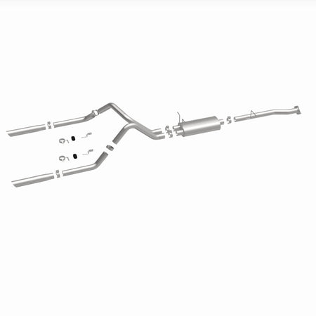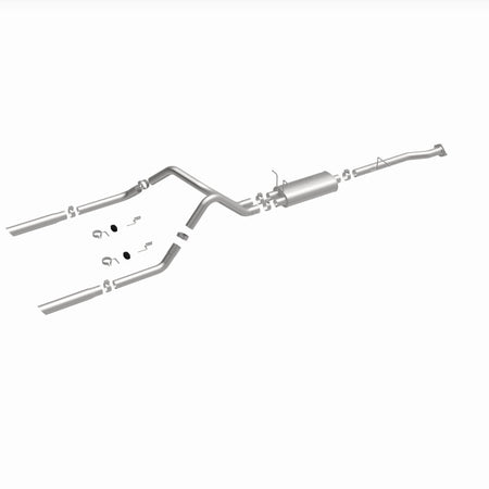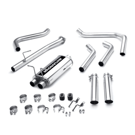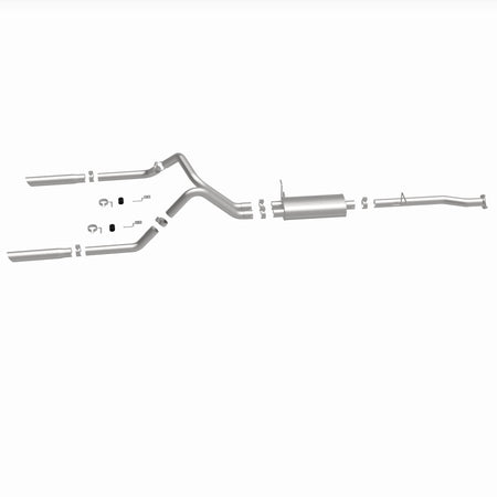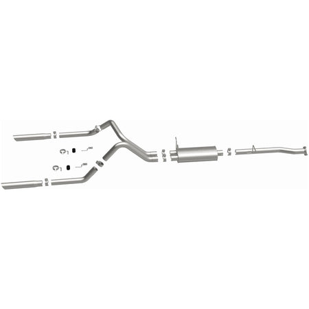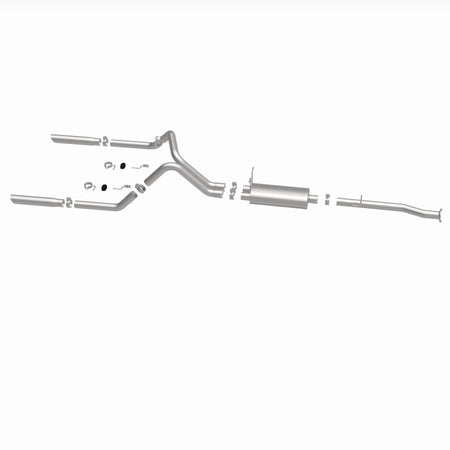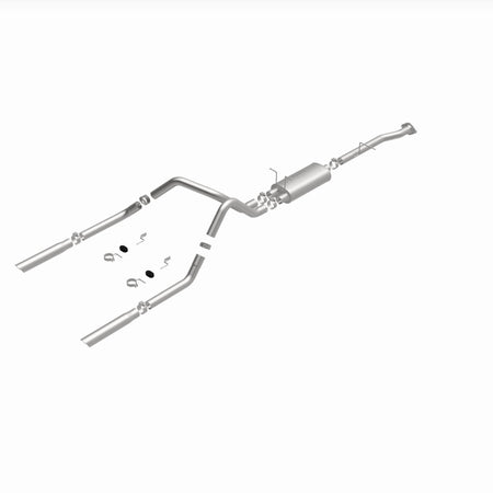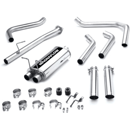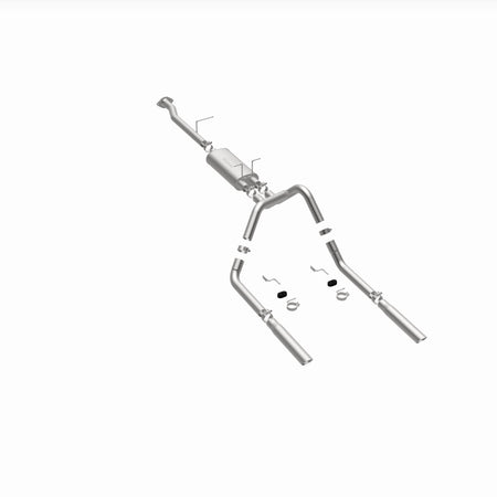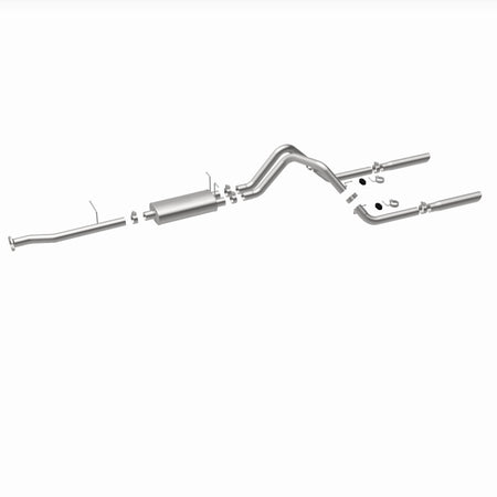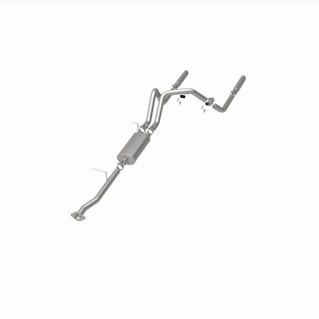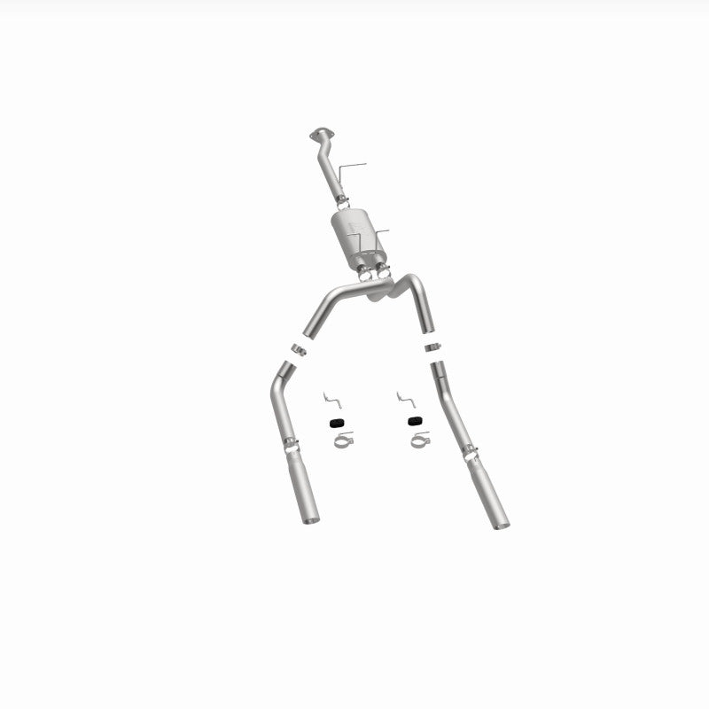 The MagnaFlow Street Series Cat-Back Performance Exhaust System 15796 brings out the personality of your Truck with our signature resonant, powerful engine tone and dyno-proven performance. Thanks to its fast-flowing, mandrel bent 2.5in. main piping and 1 Straight-Through mufflers ending in a Dual Split Rear exit with 3in. Polished Clamp-On Single Wall Angle Cut Cut Edge tips, this Truck exhaust kit has the performance chops to match its sporty sound and appearance. Upgrade your ride to the next level with an exhaust that has the pipes to put other Truck's to shame. With this system your vehicle will be producing Aggressive exterior and Moderate interior sound levels while leaving other cars and trucks feeling envious at every stoplight. Exhaust kit 15796 features a cat-back layout that replaces your ride's stock exhaust components from near the catalytic converter on back. Extensive 3D scanning during development has resulted in a direct-fit design that you can easily install yourself. 15796 is produced using CNC precision robotic manufacturing techniques and is backed by MagnaFlow's 1-year limited finish warranty and limited lifetime construction warranty.