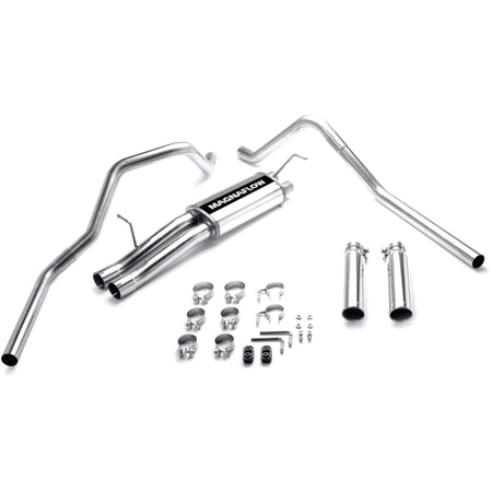 The MagnaFlow Street Series Cat-Back Performance Exhaust System 15829 brings out the personality of your Truck with our signature resonant, powerful engine tone and dyno-proven performance. Thanks to its fast-flowing, mandrel bent 3in. main piping and 1 Straight-Through mufflers ending in a Dual Split Rear exit with 3.5in. Polished Clamp-On Single Wall Angle Cut Rolled Edge tips, this Truck exhaust kit has the performance chops to match its sporty sound and appearance. Upgrade your ride to the next level with an exhaust that has the pipes to put other Truck's to shame. With this system your vehicle will be producing Aggressive exterior and Moderate interior sound levels while leaving other cars and trucks feeling envious at every stoplight. Exhaust kit 15829 features a cat-back layout that replaces your ride's stock exhaust components from near the catalytic converter on back. Extensive 3D scanning during development has resulted in a direct-fit design that you can easily install yourself. 15829 is produced using CNC precision robotic manufacturing techniques and is backed by MagnaFlow's 1-year limited finish warranty and limited lifetime construction warranty.
