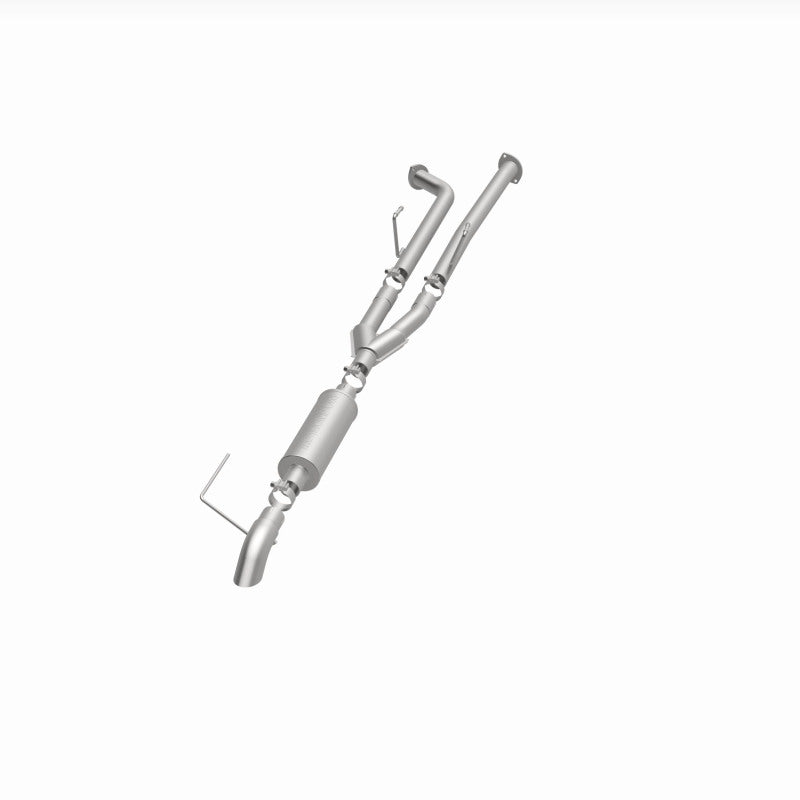 The MagnaFlow 2007-2008 Toyota Tundra Off-Road Pro Series Cat-Back Performance Exhaust System brings additional off-roading prowess and our deep signature exhaust note to your 5.7L 2007-2008 Toyota Tundra with a weight-optimized, dyno-tested, corrosion resistant and durable stainless steel design engineered to closely hug the undercarriage for improved ground clearance. Exhaust kit 17112 is engineered to produce Very Aggressive exterior and Aggressive interior sound levels. Extensive 3D scanning was used during the development of this Toyota Tundra exhaust system to create a direct-fit design, enabling a do-it-yourself installation process. 17112's emissions-legal cat-back design replaces all your truck's exhaust components from the catalytic converter on back with its 2.5in. diameter mandrel bent main piping that passes through 1 Straight-Through mufflers before ending in a turndown before rear axle exit with 3in. Satin Clamp-On Single Wall Turndown Cut Edge tips. Exhaust system 17112 is produced using advanced CNC precision robotic manufacturing techniques and backed by MagnaFlow's limited lifetime warranty.