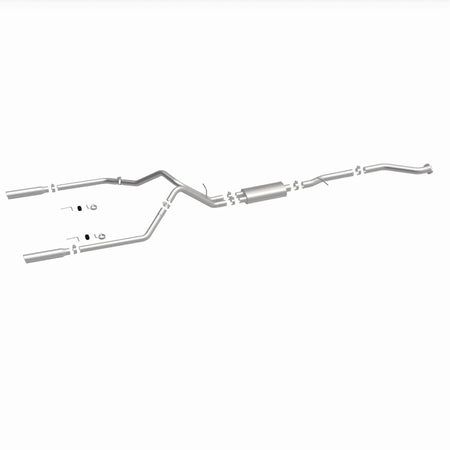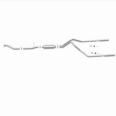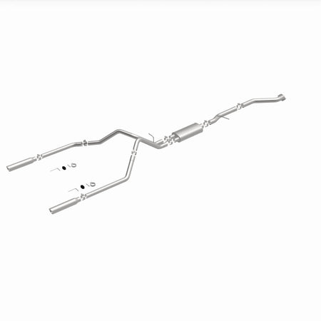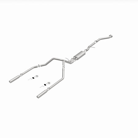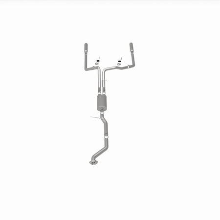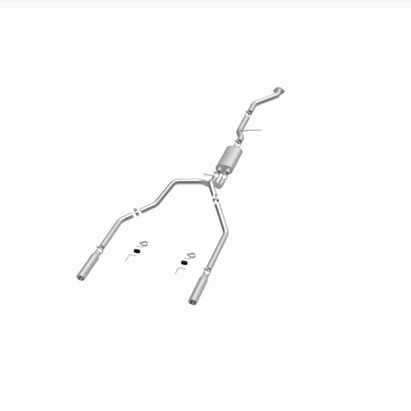 The MagnaFlow Street Series Cat-Back Performance Exhaust System 15754 brings out the personality of your Truck with our signature resonant, powerful engine tone and dyno-proven performance. Thanks to its fast-flowing, mandrel bent 3in. main piping and 1 Straight-Through mufflers ending in a Dual Split Rear exit with 3.5in. Polished Clamp-On Single Wall Angle Cut Rolled Edge tips, this Truck exhaust kit has the performance chops to match its sporty sound and appearance. Upgrade your ride to the next level with an exhaust that has the pipes to put other Truck's to shame. With this system your vehicle will be producing Aggressive exterior and Moderate interior sound levels while leaving other cars and trucks feeling envious at every stoplight. Exhaust kit 15754 features a cat-back layout that replaces your ride's stock exhaust components from near the catalytic converter on back. Extensive 3D scanning during development has resulted in a direct-fit design that you can easily install yourself. 15754 is produced using CNC precision robotic manufacturing techniques and is backed by MagnaFlow's 1-year limited finish warranty and limited lifetime construction warranty.