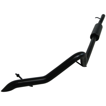 • 2.5in. Cat-Back. Turn Down Rear. Muffler Before Axle. Off-Road Tail Pipe. Black Coated Aluminized Steel.