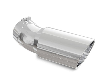 • Armor Pro Exhaust Tip; 5 in. Inlet Diameter; 6 in Outlet Diameter; 15.5 in. Length; 30 deg. Bend; Angled Rolled End; T304 Stainless Steel; Mirror Polished;