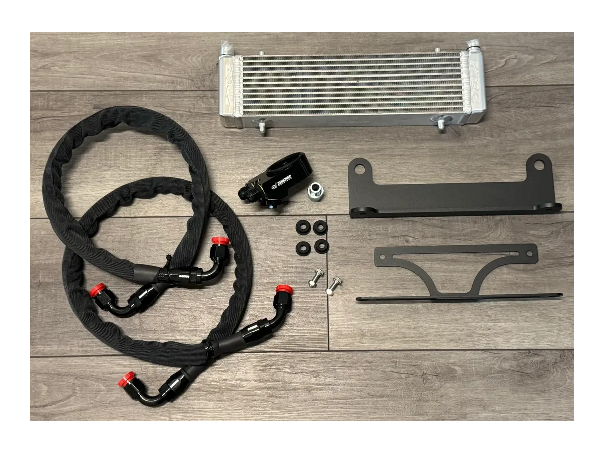 Our premier oil cooler kit includes everything that is needed for a smooth installation, without the need for any modification to the vehicle. The brackets utilize all existing factory points while situating the oil cooler in direct ambient flow.
