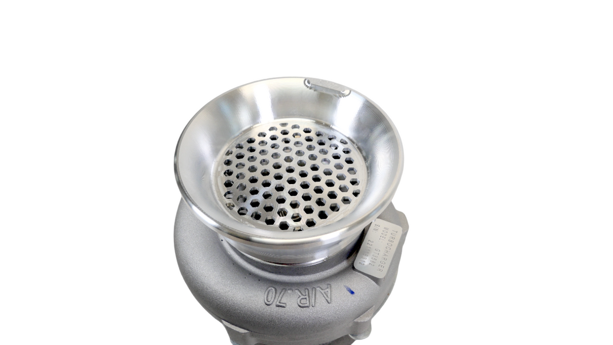 This PLM billet turbo shield protects your investment from large debris or objects from entering the compressor wheels. Made in-house here at PLM, we use aerospace billet 6061-T6 aluminum, and CNC machined it on our state of the art 5-axis machines. The entire turbo shield is made of an one-piece billet aluminum, making it lightweight, strong and will never deteriorate. Simply slip it over the compressor housing and secure it with a 2 hidden screws. Velocity stack acts like an air horn, allows smooth and even entry of air at high velocities into the compressor wheel.