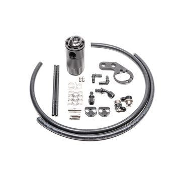 This catch can runs inline with the PCV (positive crankcase ventilation) valve and retains it’s factory function. When the intake manifold pressure is close to or greater than atmospheric pressure, the PCV “check” valve closes and, thus, this hose experiences no flow. Conversely, the PCV hose will experience “metered” vacuum when the engine is idling, steady state cruising, and decelerating. This would normally draw unwanted crankcase vapor, unspent fuel, and oil sludge into the intake manifold immediately after a high load run. Note: No inline check valve is required since Radium catch cans are pressure sealed. This means a direct intake manifold connection is permitted.