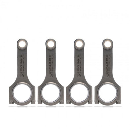 Alpha Series Rods are forged from select 4340 chromoly steel and feature an H-beam design, resulting in the ultimate strength-to-weight ratio. 4340 chromoly is one of the strongest materials available, however, not all 4340 chromoly is the same. As such, Skunk2 relies on extensive material testing and works closely with its foundry to produce high-quality rods at an affordable price. Comprehensive heat-treating, tempering, and shot-peening processes together ensure that each Alpha Series Rod remains consistent and strong. Finally, each rod is magna-fluxed to ensure integrity and that each process has been completed thoroughly and according to Skunk2's rigid specifications. Skunk2's engineers spent nearly three years developing and testing its H-beam rod design. The results are one of the strongest beam configurations available, capable of handling more than 900 hp. Engineers made use of FEA (Finite Element Analysis) to determine high-stress points and implemented features to reduce wear and increase strength. Skunk2's straight design distributes stress across a larger area when compared to tapered rods, providing additional support where necessary. Alpha Series Rods are manufactured from two-piece forgings, resulting in optimal grain orientation along the rod cap for increased strength. By orienting the metal's grain in the direction of stress along the rod cap, perpendicular to the stress exerted along the beam, strength is significantly increased. Skunk2's two-piece forgings provide a precision-tight fit between the rod's cap and its beam without resorting to the brittle materials required by other processes. Alpha Series Rods also feature dual oil passages at their pin ends, providing additional lubrication and cooling, which leads to an even stronger, more durable rod. Unlike other designs, Skunk2's carefully positioned, offset oil passages help deliver lubrication around the entire wrist pin, during each phase of the engine cycle.